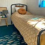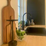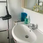 There is an equipped kitchen fitted with an electric kettle, a refrigerator, and kitchenware.